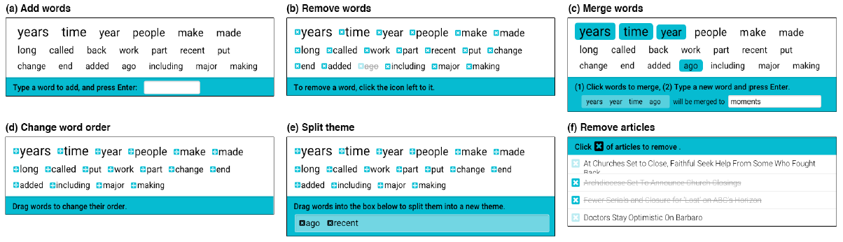 Statistical topic modeling is a common tool for summarizing the themes in a document corpus. Due to the complexity of topic modeling algorithms, however, their results are not accessible to non-expert users. Recent work in interactive topic modeling looks to incorporate the user into the inference loop, for example, by allowing them to view a model then update it by specifying important words and words that should be ignored. However, the majority of interactive topic modeling work has been performed without fully understanding the needs of the end user and does not adequately consider challenges that arise in interactive machine learning. With one workshop paper and two full research papers, we explore a subset of interactive machine learning design challenges with specific considerations for interactive topic modeling. For each challenge, we propose solutions based on prior work and our own preliminary findings and identify open questions to guide future work. I participanted in a NSF research project about interactive modeling with Alison Smith, Leah Findlator, Jordan Boyd-Graber, Kevin Seppi, and Niklas Elmqvist.
